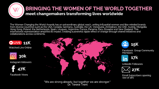 The Women Changing The World Awards are a global awards program that recognises women changemakers. Acknowledging success in business, environmental sustainability, leadership, health, education, innovation and technology.